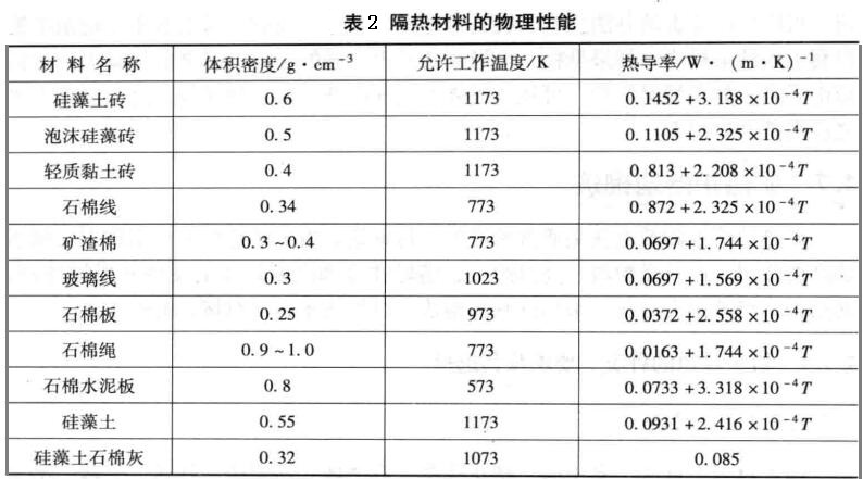 耐火材料的物理性能、力學性能見下表1。隔熱材料的物理性能見表2.