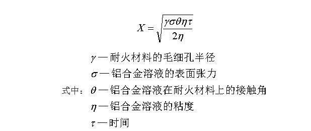 鋁合金熔煉爐襯用的耐火澆注料主要鋁合金溶液中的AL、Mg、Zn、Mn等還原性強,活潑性高的合金元素以液態(tài)或氣態(tài)的形式通過耐火澆注料內部的氣孔、裂紋、晶界向耐火澆注料內部滲透,隨之還原了耐火澆注料中的SiO2、F2O3、K2O、Na2O等氧化物,釋放金屬Si、Fe、K、Na等,使爐襯材料形成變質層,產生剝落,造成耐火材料的損毀,為此根據鋁合金溶液滲入耐火澆注料深度的近似公式: