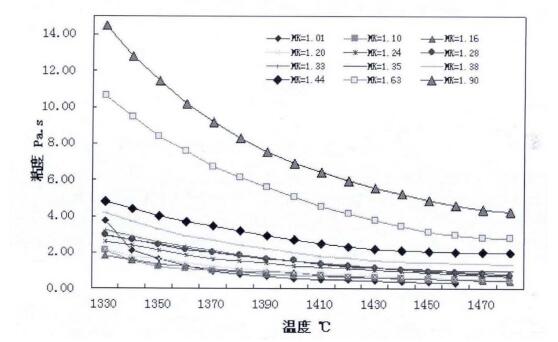 圖1表明,熔渣的粘度都隨溫度的升高逐步降低,但變化的斜率不同:酸度系數(shù)較低時(shí),粘度曲線較平滑,特別是1390℃以上時(shí),熔體粘度隨溫度升高的變化很小,說明熔渣的粘度對溫度的變化不敏感,有較寬的溫度適應(yīng)范圍;隨著酸度系數(shù)的提高,熔體粘度曲線的斜率增大,溫度的稍微波動都會導(dǎo)致溶體粘度較大的變化,曲線變得較陡峭;在相同溫度條件下,酸度系數(shù)越大粘度越高。