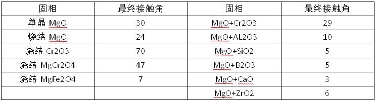 Cr2O3可降低熔渣對耐火材料的潤濕性。如表1.2所示,熔體(其成分包含SiO2 61.5%、AL2O3 17.8% 和 MgO 20.7%)在Cr2O3、MgCr2O4、MgO以及含有3%其他氧化物的MgO的耐火材料試樣上在1370℃保持2h后的接觸角,表明熔渣在Cr2O3以及含有鉻材料上的接觸角大,熔渣對含鉻材料的潤濕性差。