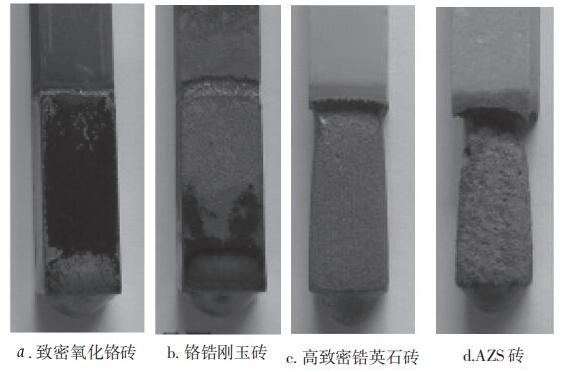 玄武巖纖維池窯法生產,首先要考慮窯爐壽命,傳統的玄武巖纖維坩堝爐采用的耐火材料,由于侵蝕快、壽命短,使用在池窯上不經濟。必須選擇更加優質的耐火材料,需對不同性質耐火材料進行篩選并進行侵蝕實驗。 有資料針對耐火材料致密氧化鉻磚、鉻鋯剛玉磚、高致密鋯英石磚、41#電熔AZS磚進行了侵蝕實驗。侵蝕情況見圖 1