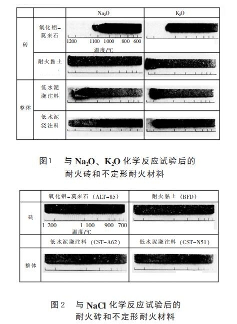高鋁磚及黏土質(zhì)耐火材料與堿性金屬鹽Na2CO3、K2CO3和NaCl 做了反應(yīng)試驗(yàn),得出以下結(jié)論: