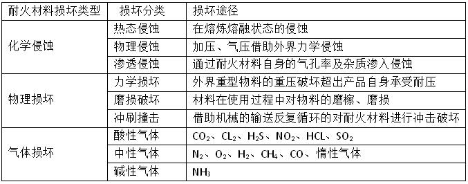 耐火磚的工作環境往往是在高溫狀態下的窯爐中作為內襯使用,然而在選用合適的窯爐內襯時候需要先了解耐火磚的自身特性并結合窯爐的工況環境和使用機理作出合適的選擇,不然很容易選錯,一旦選錯就會損失很大。比如說要了解所選用的耐火磚害怕什么,比如在氧化氣氛下不能使用C-SiC材料,在酸性工況條件下不能用MgO質產品,在堿性工況下不能用SiO2系列材料。常見的造成耐火磚使用壽命短的原因一般可以總結為三大類即:化學侵蝕、物理損壞、氣體損壞。下表為損壞方式及途徑。
