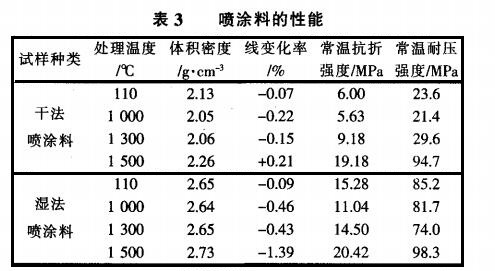 干法噴涂料與濕法噴涂料各項(xiàng)性能的檢測(cè)結(jié)果見表3。從表3可以看出濕法噴涂料經(jīng)110℃烘干后和經(jīng) 1000℃、1300℃、1500℃熱處理后的體積密度均大于干法噴涂料的體積密度常溫抗折強(qiáng)度和耐壓強(qiáng)度也均大于干法噴涂料。雖有研究表明。鋁酸鈣水泥的含量越多,材料 的抗折強(qiáng)度和耐壓強(qiáng)度越大,但這種差異可以由材料的基體而彌補(bǔ)。兩種噴涂料采用的基體材料不同,濕法噴涂料是采用鋁礬土作為基體,干法噴涂料是采用焦寶石作為基體。采用鋁 礬土作為基體的材料強(qiáng)度大,因此濕法噴涂料的力學(xué)性能優(yōu)于干法噴涂料的力學(xué)性能。