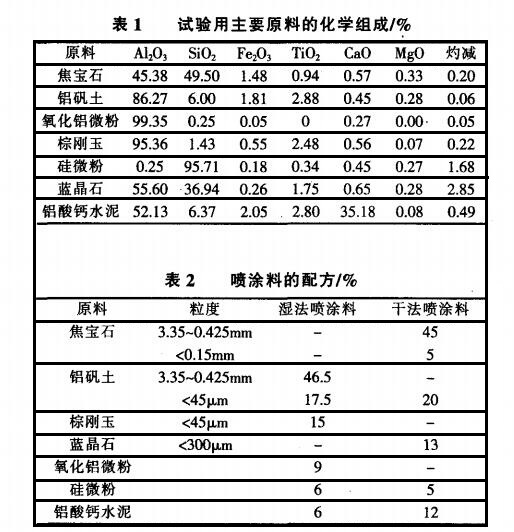 試驗(yàn)用主要原料為焦寶石、鋁礬土、棕剛玉、藍(lán)晶石、氧化鋁微粉、硅微粉和鋁酸鈣水泥 。其化學(xué)組成見表1。 濕法噴涂料和干法噴涂料的配方見表2,按表2準(zhǔn)確稱取各原料。具體是將骨料及粉料加入攪拌罐中,攪拌均勻后再加入水?dāng)嚢?min然后制備成160mmx40mmx40mm 的試樣室溫養(yǎng) 護(hù)24h后脫模。試樣經(jīng) l10℃烘 干后分別于1O00℃、1300℃和 1500℃保溫3h熱處理分別 測(cè)試濕法噴涂料和干法噴涂料經(jīng)過(guò)不同熱處理溫度后試樣的線變化率、體積密度、抗折強(qiáng)度和耐壓強(qiáng)度。