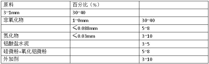 根據(jù)最緊密堆積原理和生產(chǎn)實踐經(jīng)驗,并考慮到生產(chǎn)的方便性及工業(yè)篩制的標(biāo)準(zhǔn),我們骨料顆粒選擇3~1mm、1~0mm 二級級配,將粒度為≤ 0.088mm的非氧化物細(xì)粉、硅微粉、鋁酸鹽水泥、氮化物細(xì)粉和外加劑預(yù)混均勻,然后加入 3~1、1~0mm 碳化硅骨料混合均勻 , 再加入 5% 的水?dāng)嚢杈鶆蚝蟀丛囼灧椒ǖ闹茦雍蜋z測標(biāo)準(zhǔn)進(jìn)行制樣檢測,根據(jù)試驗結(jié)果進(jìn)行配方優(yōu)選,得到了最佳配方見下表。