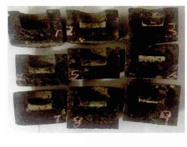 碳化硅等非氧化物材質(zhì)具有較好的抗金屬熔液滲透的性能,但由于鋁酸鹽水泥和其它成份的加入是否影響抗金屬熔液滲透的性能,針對該問題我們對該耐火材料也進(jìn)行了抗金屬熔液滲透試驗,我們選用陽極銅為實驗用金屬銅材料我們選擇氮化物為 0、8P%、12P%和結(jié)合劑鋁酸鹽水泥為0、1a%、2a%、固定骨料、硅微粉、氧化鋁微粉進(jìn)行正交配方組合試驗實驗 采用靜態(tài)坩堝法,坩堝內(nèi)裝金屬和渣混合物30 克,并將坩堝上口用碳化硅薄片磚蓋上并用碳化硅膠泥密封,然后在高溫重?zé)隣t1350℃加熱72小時,然后將坩堝沿中線切開,觀察金屬液和渣的滲透侵蝕情況,圖4為坩堝切開狀況,當(dāng)?shù)餅?,鋁酸鹽水泥為0時,金屬 液和渣全部滲透,隨著鋁酸鹽水泥和氮化硅的增加,抗金屬液和渣的滲透侵蝕變好,但當(dāng)鋁酸鹽水泥和氮化物為最大量時(9#),反而變差從圖4中可以看出6#和7# 最好,6# 氮化物加入量為8P% 和水泥加入量為0%,7# 氮化物加入量為8P% 和鋁酸鹽水泥加入量為 2a%。