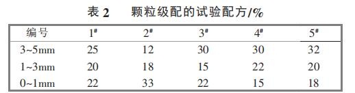 澆注料的致密程度和流動性跟顆粒級配密切相關(guān),而最佳的顆粒級配又隨骨料種類、臨界粒度的大小和基質(zhì)組成的不同而不同,最合適的顆粒級配應(yīng)該由試驗(yàn)確定。本試驗(yàn)選擇了5 種不同的顆粒級配,細(xì)粉部分全部相同,顆粒級配的試驗(yàn)配方如表2所示。