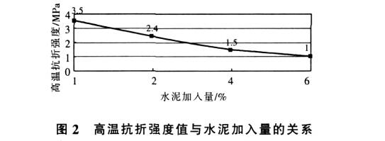 首先選擇兩組水泥加入量,一組加 4%,一組加5%,各組中的uf-SiO2和α-Al2O3有所調(diào)整。試驗(yàn)結(jié)果顯示,所有配方的常溫耐壓強(qiáng)度都大于80MPa, 但1 500℃下保溫0.5h的高溫抗折強(qiáng)度均小于1MPa,這說明水泥的加入量太大。為了驗(yàn)證水泥對高溫抗折強(qiáng)度的確切影響,又進(jìn)行了一組試驗(yàn)。試驗(yàn)方案為:將水泥量從1%逐漸增大到6%,α-Al2O3 固定不變,碳化硅的加入量固定為16%, uf-SiO2的量隨水泥量而調(diào)整以保持基質(zhì)總量不變。試驗(yàn)結(jié)果如圖2所示。