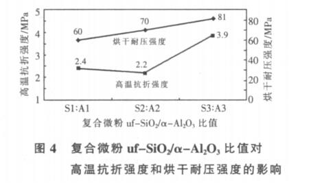 3.4 復(fù)合微粉中 uf-SiO2 和 α-Al2O3 的比例對高溫抗折強(qiáng)度和烘干耐壓強(qiáng)度的影響