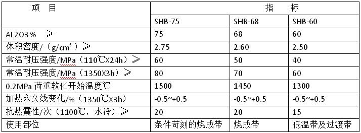 活性石灰回轉(zhuǎn)窯用不燒磷酸鹽磚按使用部位、使用條件以及理化指標(biāo)分為SHB-75、SHB-68和SHB-60三個(gè)牌號(hào),牌號(hào)中S、H、B分別為“石灰”“回轉(zhuǎn)窯”“不燒”的首個(gè)漢字的漢語拼音首字母,阿拉伯?dāng)?shù)字為三氧化二鋁的質(zhì)量百分?jǐn)?shù)。
