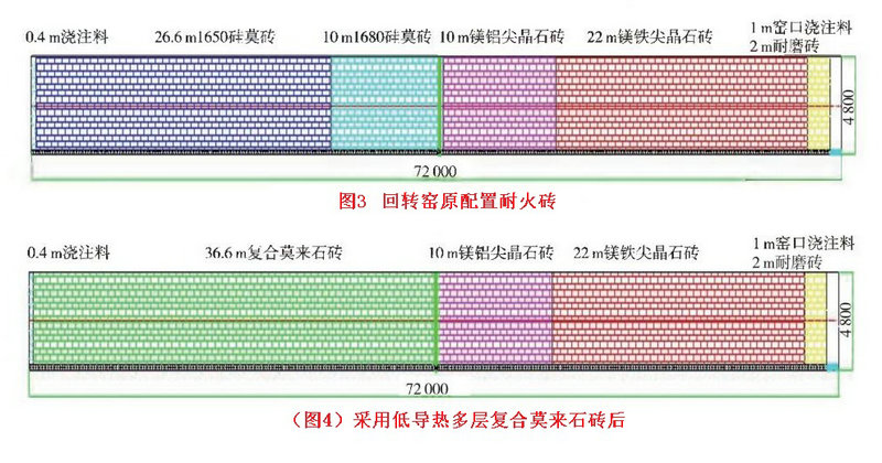 在市場競爭日趨白熱化的水泥市場,回轉窯耐火磚的選用更能進一步降低熟料的生產成本,具體表現在耐火磚的使用壽命和隔熱效果。目前回轉內用耐火磚有硅莫復相磚、鎂鋁尖晶石磚、鎂鐵尖晶石磚等。為了有效減少回轉窯筒體表面散熱,選用低導熱多層復合莫來石磚替代回轉窯分解帶和過渡帶約47 m的硅莫磚,不僅降低了相應部位筒體表面的散熱,還減輕了窯體的自重為企業生產降低了成本。
