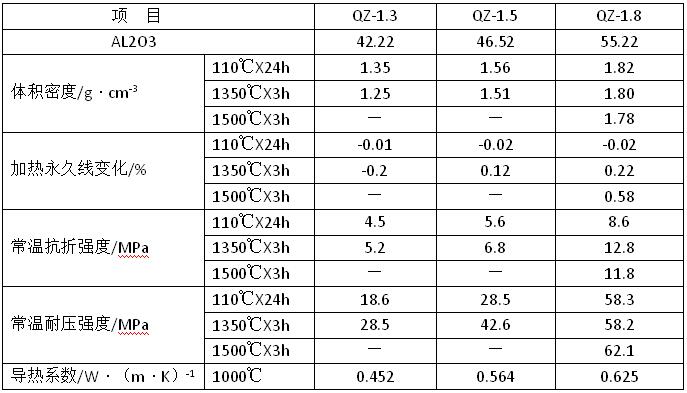 傳統(tǒng)輕質(zhì)澆注料的原料配制主要采用輕質(zhì)骨料與重質(zhì)細(xì)粉,所用輕質(zhì)骨料的氣孔直徑較大且強(qiáng)度較低,因此輕質(zhì)澆注料的導(dǎo)熱系數(shù)較高,同時因骨料強(qiáng)度低而影響輕質(zhì)澆注料的整體強(qiáng)度,限制了其在更高溫度下的使用。因此將拋棄傳統(tǒng)的生產(chǎn)工藝此次采用微孔骨料和高強(qiáng)骨料。所用原料主要有微孔輕質(zhì)莫來石、空心球、高鋁礬土、漂珠、藍(lán)晶石、二氧化硅微粉、氧化鋁微粉、純鋁酸鈣水泥、生礬土粉、紅柱石等,各種原料按比例稱量,加入攪拌機(jī)中先干混2min,后加水?dāng)嚢杈鶆颍駝訚仓?0mmX40mmX160mm的條形試樣,養(yǎng)護(hù)24h脫模,經(jīng)110℃X24h烘干,1350℃X3h燒后按有關(guān)標(biāo)準(zhǔn)檢測其體積密度、常溫耐壓強(qiáng)度、高溫抗折強(qiáng)度、加熱永久線變化、導(dǎo)熱系數(shù)等指標(biāo)。