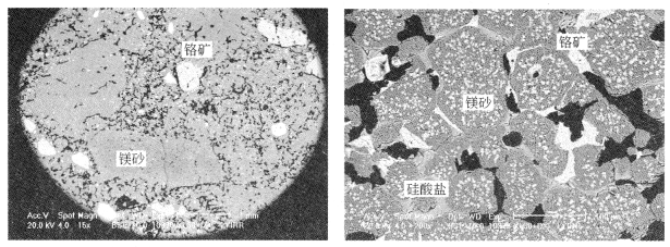在圖3-la中,灰色顆粒為鎂砂,白色的中顆粒為鉻礦。在圖3-lb中,白色顆粒為鉻礦,灰色渾圓狀顆粒為鎂砂,由于該硅酸鹽結(jié)合鎂鉻磚燒成溫度高,大于1580℃,因此,鎂砂顆粒內(nèi)包含有大量的尖晶石脫溶相。由圖3-1可知:硅酸鹽結(jié)合鎂鉻磚的基質(zhì)中主晶相為粒狀方鎂石,鎂砂和鉻礦顆粒間或各自顆粒間則多以灰白色薄膜狀硅酸鹽(CMS)膠結(jié)相或?yàn)闅饪姿綦x,其次有少量的復(fù)合尖晶石(白色)填充于方鎂石晶間,但直接結(jié)合程度很低。基質(zhì)為較致密的網(wǎng)絡(luò)狀結(jié)構(gòu),氣孔多為條狀,少部分呈封閉趨勢。由于硅酸鹽結(jié)合的顯微結(jié)構(gòu)特征不利于普通鎂鉻耐火制品的高溫力學(xué)性能和抗化學(xué)侵蝕性能,因此硅酸鹽結(jié)合鎂鉻磚通常用于對(duì)性能要求不苛刻的部位。