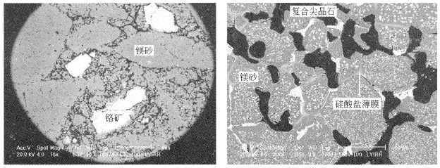 從圖3-2中可以明顯看出,直接結(jié)合鎂鉻磚基質(zhì)中的主晶相仍為粒狀方鎂石,其晶內(nèi)亦包含有大量的尖晶石脫溶相(方鎂石晶粒內(nèi)的白色析出物)其次有少量的復(fù)合尖晶石(白色)和灰白色薄膜狀硅酸鹽相填充于方鎂石晶間。主晶相方鎂石主要通過方鎂石-方鎂石、方鎂石-鉻礦(復(fù)合尖晶石)結(jié)合在一起,即晶粒間以直接結(jié)合為主;另一部分則通過少量的硅酸鹽相薄膜膠結(jié)在一起。直接結(jié)合的顯微結(jié)構(gòu)特點(diǎn)顯著提高了該種鎂鉻磚的高溫性能、抗侵蝕與抗沖刷,使其成為目前應(yīng)用較普遍的一種鎂鉻磚。直接結(jié)合鎂鉻磚在有色冶煉爐、水泥窯等使用條件苛刻的部位均得到了廣泛應(yīng)用。