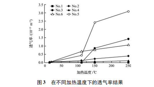 測定結(jié)果示于圖3。根據(jù)這次測定的結(jié)果,從養(yǎng)生到250 ℃加熱處理,沒有加入添加劑的試樣幾乎沒有透氣性。為了提高養(yǎng)生體脫水時的透氣率,加入了特殊添加材料X的No.2試樣、No.5 和 No.6試樣在從養(yǎng)生到加熱250 ℃時透氣性有所提高。另外發(fā)現(xiàn)加入了有機(jī)纖維A 的No.3和No.5試樣,在150 ℃加熱時透氣率提高很大。加入了有機(jī)纖維B的No.4 試樣和 No.6 試樣,在150 ℃和250 ℃加熱時透氣率提高。并用特殊添加材料和有機(jī)纖維的No.5 試樣和No.6 試樣,由于疊加效果的作用,透氣率大幅度提高。尤其是No.5 試樣,150 ℃ 加熱后透氣率顯著提高,特殊添加材料和有機(jī)纖維A并用特別有利于形成連通氣孔。