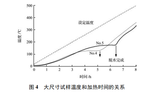 No.5 試樣透氣率有所提高,為了比較,對 No.4試樣進(jìn)行了干燥試驗。所獲得的試樣內(nèi)部溫度曲線示于圖 4。對應(yīng)設(shè)定溫度,No.4 試樣和 No.5 試樣幾乎都是按照相同的速度持續(xù)升溫,但是 No.4 試樣在 130 ℃附近升溫速度放緩,推測最大蒸汽壓力大約是0.3 MPa。而 No.5 試樣是在180 ℃放緩,推測蒸汽壓力大約是 1.0 MPa。另外從拐點位置算起,No.4 試樣的脫水完成時間比 No.5 試樣快 1.3 h 左右。由圖可知,No.4 試樣尺寸大、透氣率高、內(nèi)部蒸汽壓力沒有提高,干燥結(jié)束時間也早。