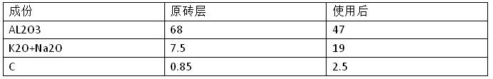 2. 這種堿金屬的破損作用伴隨著爐內生產時候的煙碳沉析,當高溫爐內耐火材料失去強度的時候,往往有堿金屬、鋅和煙碳共存,并在完全沒有新生態氧化物的催化作用下,在爐內下部1200℃的高溫區內仍有煙碳沉析,這絕不是反應所致,當停爐后檢測爐襯耐火材料的成分分析如下: