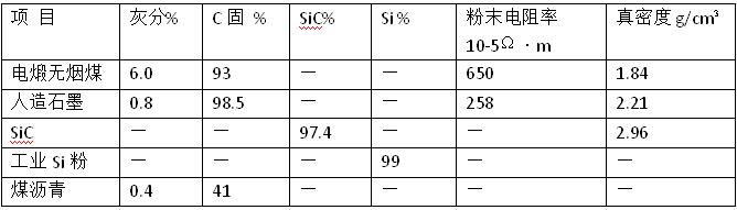 原料選用經(jīng)1750-2000℃的電煅燒無煙煤此時已經(jīng)半石墨化,石墨化呈度達(dá)15%~30%,它的結(jié)構(gòu)致密、強度高。因此,以其作為主要原料。為提高導(dǎo)熱系數(shù)、耐堿性,改善成型性,加入少量人造石墨。另外加入SiC,原因在于SiC比碳優(yōu)先氧化生成SiO。保護(hù)膜,覆蓋于表面,阻止制品進(jìn)一步氧化,可提高炭制品的抗氧化性。為提高材料的質(zhì)量,加入少量工業(yè)硅微粉,在焙燒成過程中,工業(yè)硅微粉與碳發(fā)生了Si(s)+C(s)→β-SiC(s)反應(yīng) ,生成物β-SiC,可賦予制品較高強度和耐磨性少量氣孔壁上未反應(yīng)的Si與氣孔中的氧、氮發(fā)生4Si(s)+ 2N2 (g)+ O2 (g)→2Si2ON2 (s)反應(yīng) Si2ON2 為針狀結(jié)晶,使氣孔變細(xì)或封閉、堵塞氣孔,降低制品透氣度,阻止渣、鐵的滲透,提高耐氧化性。各種原料的理化性能見表1。