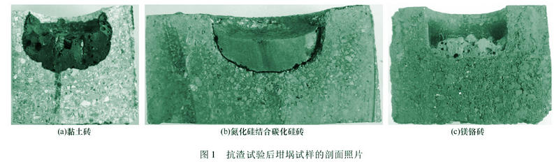 抗渣試驗采用靜態(tài)坩堝試驗方法,在試樣的中間鉆取內(nèi)孔φ36mmX30mm的坩堝試樣,將20g煙塵渣放入坩堝內(nèi)孔中,在1300℃保溫24h后,沿坩堝中心軸切開,觀測其侵蝕情況,試樣的剖面照片見圖1,可以看出:粘土磚侵蝕最為嚴(yán)重,氮化硅結(jié)合碳化硅磚次之,鎂鉻磚幾乎沒有侵蝕。
