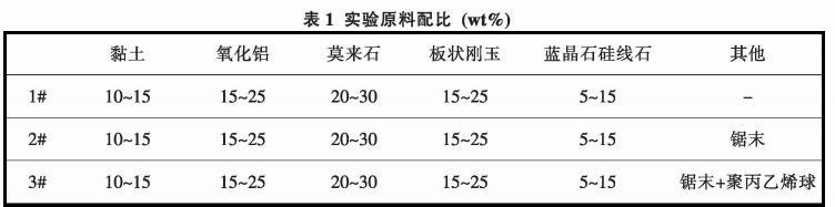 1.1原料,實驗主要原料如下:粘土、煅燒氧化鋁(Al203)>99%,煅燒莫來石粉A1203>65%,板狀剛Al203>99.4%、藍晶石和硅線石。實驗所用的泡沫劑為十二烷基磺酸鈉,所用的燃盡物為鋸末和聚丙乙烯球,結合劑為聚乙烯醇(PVA)。