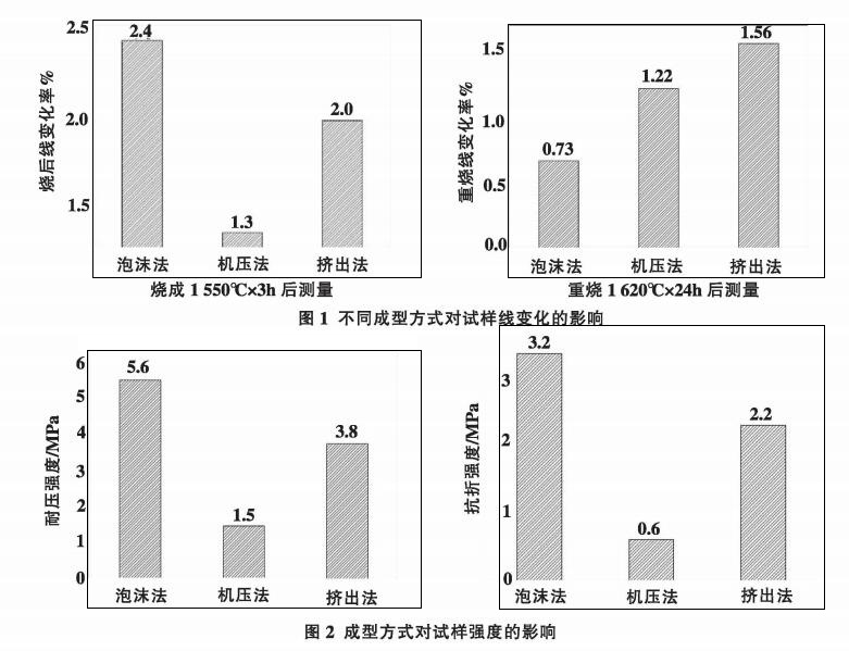 從圖1可以看出,莫來石質隔熱耐火磚試樣經1550℃燒成3h后,采用泡沫法制備的樣品線收縮率最大,達到2.4%;而采用擠壓法制備的樣品線收縮率最小,僅為1.3%。進一步將試樣在1620℃的溫度下重燒12h,采用泡沫法制備的樣品重燒線收縮率反而最小為0.73%;而采用擠出成型方式制備的樣品重燒線收縮率最大,達到了1.56%。