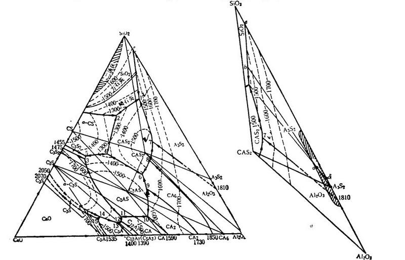處于A-C-S系統內,它跨越兩個分三角形。由此可以看出:配料組成點在A-CAS2-A3S2三角形內,制品的礦物組成則主要是莫來石和剛玉,在前一三角形內開始出現液相的理論溫度是(1345℃);在后三角形內開始出現液相的理論溫度是(1512℃)。但是由于有其它雜質的存在,實際出現液相的溫度要低于理論溫度。實測發現高鋁制品一般在1200℃開始出現液相,而且液相粘度低。出現有CAS2、x-石英。從熱變可以看出: