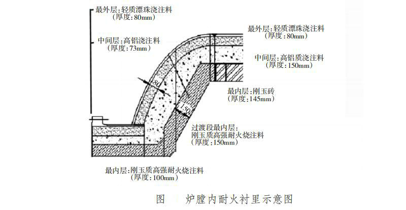 鋼殼體筒體段耐火襯里分3層(見圖)最外層為輕質(zhì)漂珠澆注料襯里,厚度為80mm;最內(nèi)層為剛玉磚,厚度為145mm;中間層為高鋁質(zhì)澆注料,厚度為150mm,剛玉磚層與中間層的間隙為5mm。