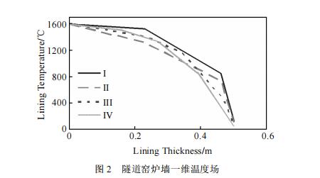以爐墻內壁溫度為1600℃隧道窯為例,爐襯厚度500mm,爐襯耐火材料分別為氧化鎂磚、氧化鋁空心球磚、輕質粘土保溫磚、JM23 絕熱保溫磚、輕質莫來石磚、耐火纖維板。設計的1600℃隧道窯爐襯結構如下:爐襯結構Ⅰ為40mm 纖維板+230mm 輕質粘土保溫磚+230 mm 氧化鎂磚的復合爐襯;爐襯結構Ⅱ為40 mm纖維板+230 mm輕質粘土保溫磚+230mm氧化鋁空心球磚的復合爐襯;爐襯結構Ⅲ為40 mm纖維板+115 mm JM23絕熱保溫磚+115mm輕質莫來石磚+230mm氧化鋁空心球磚的復合爐襯;爐襯Ⅳ為采用110mm纖維板+115mmJM23絕熱保溫磚+115mm輕質莫來石磚+160mmAL2O3空心球磚的窯襯結構。爐墻外壁的對流輻射綜合傳熱系數和計算環境溫度數值同上