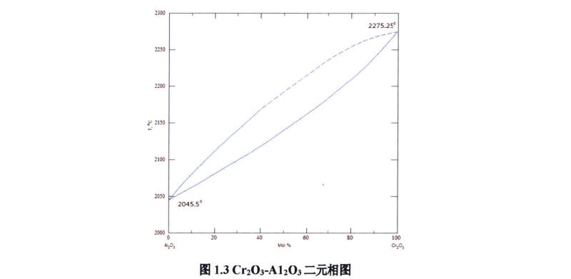 Cr203和AL203的晶體結構相同,離子半徑相差13.7%,因此,高溫下Cr203和AL203可以形成無限固溶體,如圖1.3所示。從液一固相線看,隨著Cr203含量的增加,開始出現液相的溫度也隨之升高,因此在A1203中添加適量的Cr203能顯著改善剛玉系耐火材料力學性能和高溫使用性能。
