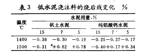 低水泥澆注料燒后線變化如表3.當(dāng)溫度在1400℃以下時(shí),低水泥澆注料的線變化為負(fù)值(收縮),但不太大。至1500℃時(shí)為正值(膨脹),其值為+0.1%~0.8%之間。這一特性體現(xiàn)了低水泥澆注料高溫體積穩(wěn)定性好,低水泥澆注料在加熱過程中,熱膨脹曲線為平緩且在整個(gè)過程區(qū)域內(nèi)不呈現(xiàn)收縮的特點(diǎn),這對于不定型耐火材料很重要的。