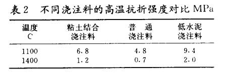 圖2為低水泥澆注料與普通澆注料、粘土澆注料強(qiáng)度變化的比較。可見,低水泥澆注料常溫強(qiáng)度較高,而中溫強(qiáng)度也不降低。表2表明了不同澆注料高溫?zé)釕B(tài)抗折強(qiáng)度的對比,可見低水泥澆注料的高溫抗折強(qiáng)度為普通澆注料的2~3倍,比粘土的也提高了許多。著說明低水泥澆注料兼有普通澆注料和粘土澆注料兩者的優(yōu)點(diǎn),它在各種溫度下都有高強(qiáng)度的特點(diǎn),這對于溫度高,出鋼頻繁,鋼錠和鉗吊經(jīng)常碰撞的場合,無疑是有好處的。