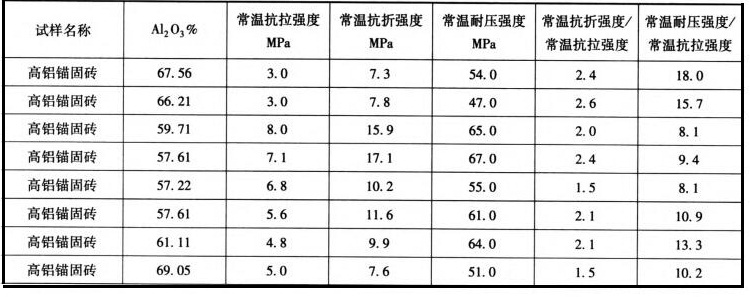 高鋁錨固磚作為高溫材料,其損壞機理主要是熱機械應(yīng)力。在實際應(yīng)用中,當(dāng)材料的局部壓應(yīng)力達到耐壓強度,或者局部拉應(yīng)力達到抗拉強度時,裂紋就在此處最先形成,在熱應(yīng)力和殘余應(yīng)力的綜合作用下擴展,最終造成高鋁錨固磚的開裂和剝落。 以下是實驗測試各種不同的AL2O3含量的錨固磚抗拉強度。