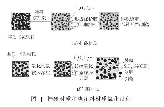 圖1表示了掛磚材質和澆注料材質在氧化侵蝕過程中的變化特征,由于澆注料材料致密度方面要低于掛磚,且碳化硅氧化過程中體積膨脹明顯,最終導致澆注料開裂,加速材料退化。對 于掛磚,廠內制磚過程中加入抗氧化的添加劑,同時調控燒磚氣氛,因此,掛磚材質體積穩定,不 易開裂/剝落,從而抗氧化能力遠高于澆注料,同時,致密度越高的材料抗氧化程度越強。