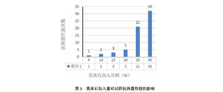 以白剛玉、燒結莫來石為主要原料,以AL2O3微粉、Cr2O3微粉、少量添加劑為基質,以進口木質素溶液為結合劑,莫來石加入量(質量分數分別為0、5%、10%、15%、20%、25%、30%)對鉻剛玉磚抗熱震性能和其他物理性能的影響。結果表明:1600℃燒后試樣,隨著莫來石加入量的增加,體積密度和耐壓強度均會呈下降趨勢,抗熱震性能則呈逐漸增加趨勢,但增加的量并不明顯,只有加入量在25%以上時抗熱震性能則會降低。綜合對比,莫來石加入量在25%~30%著個區間比較合適,既能滿足熱震需求,又能保證其他物理指標處于均衡狀態。不同莫來石加入量對試樣抗熱震性能的影響如圖1所示。