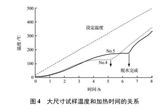 No5 試樣透氣率有所提高,為了比較,對 No4試樣進行了干燥試驗。所獲得的試樣內(nèi)部溫度曲線示于圖4。對應(yīng)設(shè)定溫度,No4 試樣和 No5 試樣幾乎都是按照相同的速度持續(xù)升溫,但是 No4 試樣在 130 ℃附近升溫速度放緩,推測最大蒸汽壓力大約是0.3 MPa。而No5試樣是在180 ℃放緩,推測蒸汽壓力大約是 1.0 MPa。另外從拐點位置算起,No4 試樣的脫水完成時間比 No5 試樣快 1.3 h 左右。由圖可知,No4 試樣尺寸大、透氣率高、內(nèi)部 蒸汽壓力沒有提高,干燥結(jié)束時間也早。