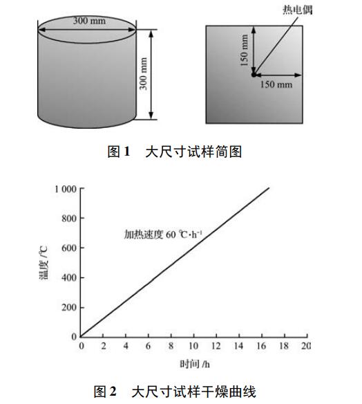 試樣的簡圖示于圖 1。圖 1 所示試樣的尺寸是Φ300 mm × 300 mm,熱電偶置于150 mm × 150 mm中心位置,混煉好的澆注料進行澆注,養(yǎng)生24 h。如圖2所示,脫模后以60 ℃ / h的速度加熱1000 ℃。根據(jù)所獲得的試樣內(nèi)部溫度曲線對干燥特性進行了評價。