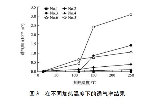 測定結(jié)果示于圖 3。根據(jù)這次測定的結(jié)果,從養(yǎng)生到250 ℃加熱處理,沒有加入添加劑的試樣幾乎沒有透氣性。為了提高養(yǎng)生體脫水時的透氣率,加入了特殊添加材料X 的 No2 試樣、No5 和 No6試樣在從養(yǎng)生到加熱250 ℃時透氣性有所提高。另外發(fā)現(xiàn)加入了有機纖維A的 No3 和 No5 試樣,在 150 ℃加熱時透氣率提高很大。加入了有機纖維 B的 No4 試樣和 No6 試樣,在 150 ℃ 和 250 ℃ 加熱時透氣率提高。并用特殊添加材料和有機纖維的No5 試樣和 No6 試樣,由于疊加效果的作用,透氣率大幅度提高。尤其是 No5 試樣,150 ℃加熱后透氣率顯著提高,特殊添加材料和有機纖維 A 并用特 別有利于形成連通氣孔。