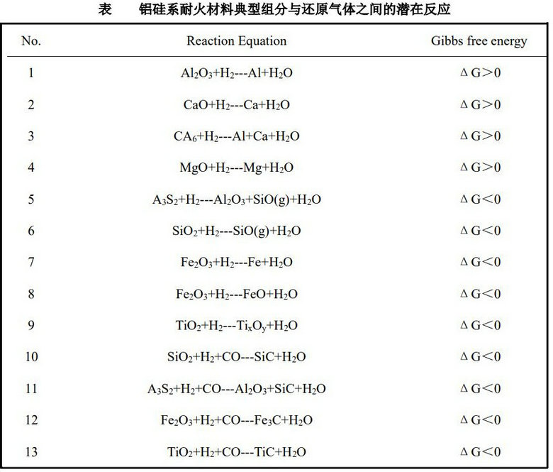 耐火材料在還原性窯爐服役環境下,還原性氣體會通過氣孔進入耐火材料內部,與鋁硅系耐火材料中的部分組分以及氧化鐵等雜質發生還原反應,進而引起內部結構的變化,影響服役性能,因此,對鋁硅系耐火材料的主要化學成分進行還原氣氛下的化學反應熱力學模擬計算,能夠明確不同組分在還原氣氛下的穩定性情況,指導耐材選取。
