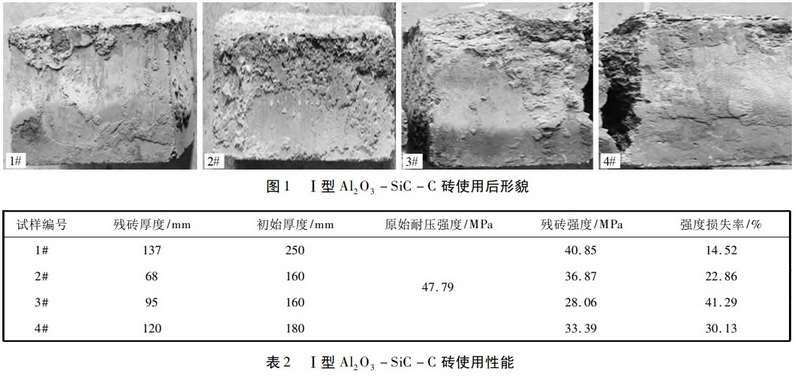 某鋼廠采用“一包到底”工藝,高爐受鐵、鐵水運輸、KR攪拌脫硫等操作完全在鐵水包內進行。目前鐵水包容量為300 t和210 t,KR脫硫率為100%,脫硫攪拌頭轉速120~160 rad /min ,脫硫時間20~25 min,脫硫劑為石灰+氟化鈣,噸鐵消耗13~16 kg。前期選Ⅰ型Al2O3-SiC -C磚作為鐵水包的工作襯,侵蝕速率達0.6 mm /爐次,包壁侵蝕不均勻,尤其是渣線部位侵蝕嚴重。為研究高脫硫比鐵水包內Ⅰ型 Al2O3-SiC-C磚的侵蝕機理,提高鐵水包在線運行的安全性,需對Ⅰ型Al2O3-SiC-C磚進行性能分析。Ⅰ型Al2O3-SiC-C磚使用后形貌及實際性能分別見圖1和表2。